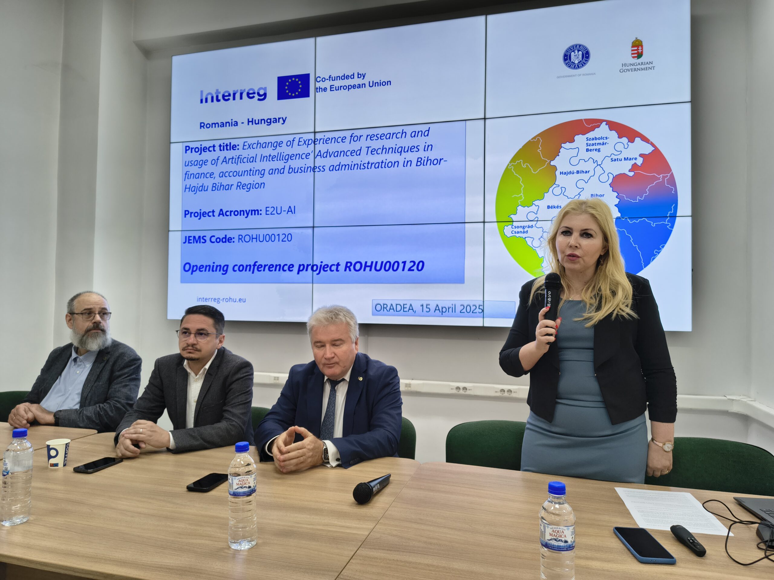 Sala de conferințe a Bibliotecii Universității din Oradea a găzduit marți, 15 aprilie 2025, lansarea proiectului RO-HU „Schimb de experiență pentru cercetare și utilizarea tehnicilor avansate de inteligență artificială în finanțe, contabilitate și administrarea afacerilor în regiunea Bihor-Hajdú-Bihar”. La eveniment au fost prezenți: rectorul Universității din Oradea, prof. univ. dr. habil. Constantin Bungău, prodecanul Facultății de Economie și Business a Universității din Debrețin, prof. dr. Erdey Laszlo, subprefectul județului Bihor, Emilian Pavel, prof. univ. dr. habil. Diana Sabău-Popa, decanul Facultății de Științe Economice și coordonatorul proiectului, reprezentanți ai instituției academice din reședința comitatului Hajdu-Bihar, studenți și cadre didactice, invitați din mediul economic.